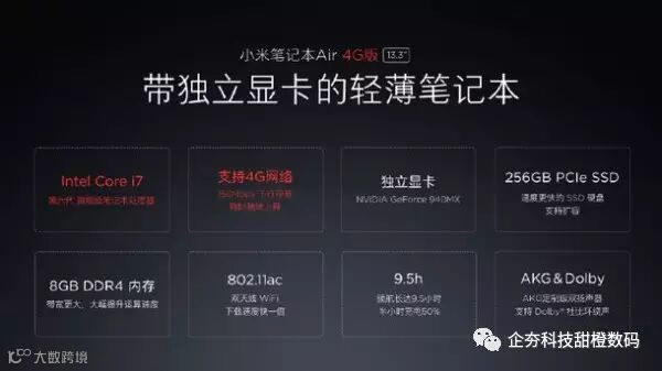 配置方面,小米笔记本Air 4GB版依旧有12.5和13.3英寸两个版本,与前代产品相似,13.3英寸版本搭载英特尔酷睿i7处理器,性能再提升10%,双核四线程,主频高达3.0GHz,8GB DDR4内存,Nvidia 940MX独立显卡,256GB PCIe SSD硬盘,支持扩容,续航时间达到9.5小时,并且配备了AKG定制双扬声器。