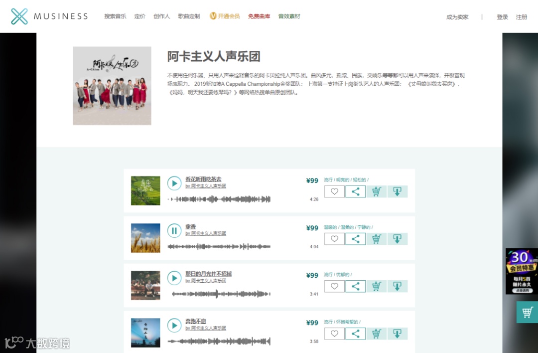 阿卡主义人声乐团作品现已全面上线MUSINESS版权音乐平台,可授权商业广告、短视频、线下公播等用途,适用于微电影故事片、公益广告、幽默广告等多类场景。