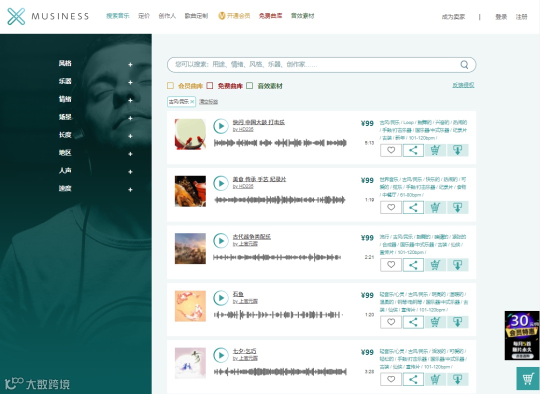 MUSINESS音乐素材网(www.musiness.vip),聚合了约300,000首优质大牌音乐、配乐、音效曲库及配音cv声展区,含数百位好莱坞音乐制作人作品,是世界经典名曲《班得瑞》全部15张专辑在中国大陆地区的独家授权代理。广告配乐、短视频背景音乐、元宇宙空间环境音乐、影视配乐、游戏BGM、动漫BGM等需求均可在MUSINESS音乐素材网中依据标签和关键词搜索下载,并获得音乐授权使用证书。MUSINESS音乐素材网开放了部分免费音乐曲库,让用户尽情享受正版音乐商用的自由。