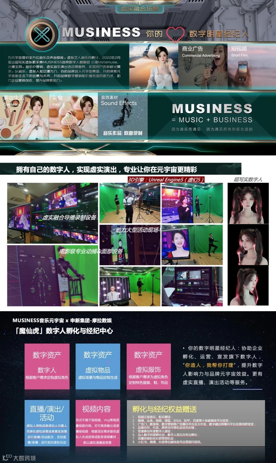 为元宇宙提供全方位音乐及声音赋能、数字明星孵化与经纪。2022年2月推出超写实虚拟歌手兼MUSINESS首席数字人客服官小缪Metamuse,火爆全网,首支单曲MV冲上微博热门视频「全站总榜」,是「支持正版从我做起」公益活动的形象大使,话题3000万阅读,3万+讨论,两次登上微博热搜。2022年10月与申新集团战略合作成立数字人孵化经纪中心,提供“你的数字明星经纪人”服务,协助企业孵化运营宣发旗下数字人,“你造人,我帮你打理”,提升数字人影响力与品牌元宇宙效益。更有虚实直播、演出活动等服务。2022年11月,MUSINESS入选2022上海市虹口科委孵化项目(元宇宙方向),以音乐、虚拟人和动画为介,协助品牌进入元宇宙赛道,共同探索元宇宙新生态下的远景与未来,开启品牌数字营销和价值传递的新方式,助力企业营销创收,提升品牌影响力。