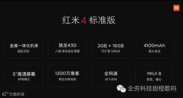 红米4标准版则采用了骁龙430处理器,5寸高清屏幕,内存容量则为2GB+16GB。