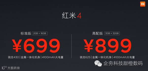 两个版本售价依然延续了红米的高性价比。标准版售价699元,高配版售价899元。相比友商同配置的手机而言,性价比依然凸显。红米4将再11月7日上午10点线上全网及线下小米之家同步发售。