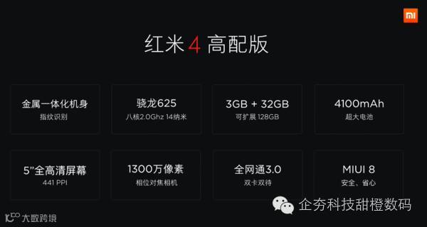 红米4通过直播进行了发布,林斌也亮相介绍了红米4的主要亮点。林斌表示红米4是“千元价格、旗舰设计”。红米4共有银白、金色和深灰三种配色,采用全金属机身+2.5D玻璃设计,后置指纹识别,并且再背面采用了陶瓷喷砂工艺。配置方面,红米4共有两个版本,其中高配版搭载骁龙625处理器,屏幕采用5英寸1080p屏,像素密度达到441PPI。内存上提供3GB+32GB存储组合并支持扩展到128GB。电池容量为4100mAh,可持续通话2天。