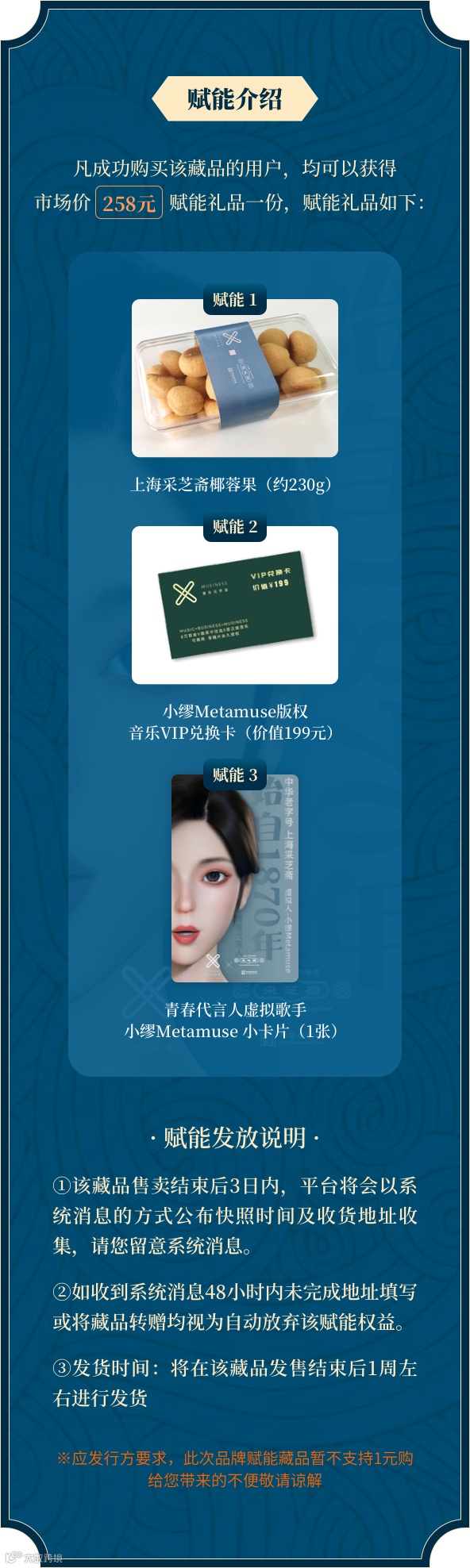 藏品赋能:MUSINESS版权音乐联合上海采芝斋共同赋能本次徽章发行,拥有该藏品的藏友可获得价值258元三重赋能礼品,内含:上海采芝斋椰蓉果1份;小缪Metamuse版权音乐VIP兑换卡1份;青春代言人虚拟歌手小缪Metamuse形象小卡1份
