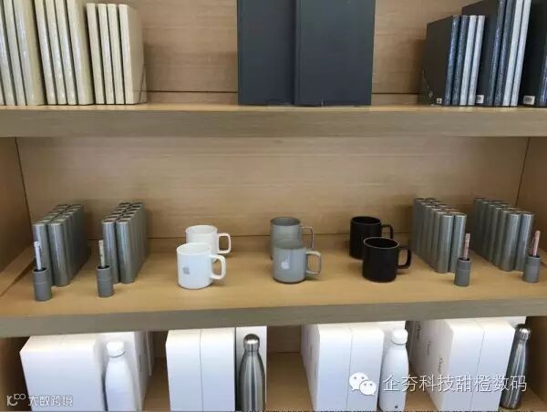 右面墙壁陈列着的也是此店独有的纪念品,硬皮笔记本、热水瓶和咖啡杯。除了这些,你还可以买到印有苹果Logo的圆珠笔(银色、金色和玫瑰金)。