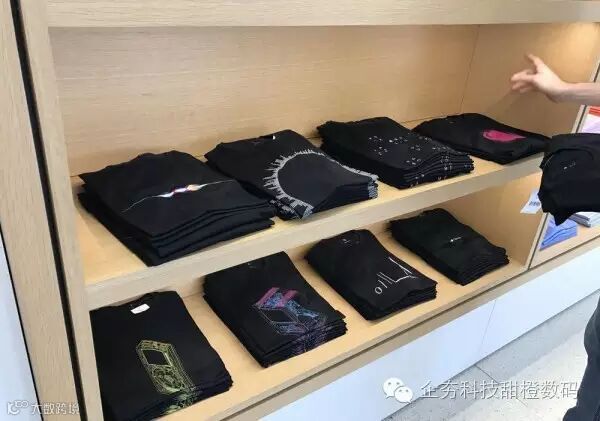 左面墙壁的T恤衫展区有16种款式可选,一半黑色,一半彩色。黑色款会根据季节更换款式。