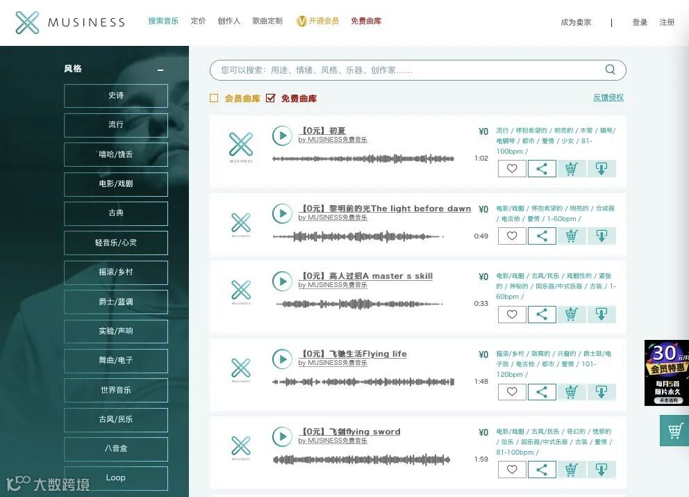 MUSINESS商用版权音乐平台:聚合了约300,000首优质大牌音乐、配乐、音效曲库,含数百位好莱坞音乐制作人作品,是世界经典名曲《班得瑞》全部15张专辑在中国大陆地区的独家授权代理。广告配乐、短视频背景音乐、影视配乐、游戏BGM、动漫BGM等需求均可在MUSINESS曲库中依据标签和关键词搜索下载,并获得音乐授权使用证书。MUSINESS还开放了部分免费音乐曲库,让用户尽情享受正版音乐商用的自由。