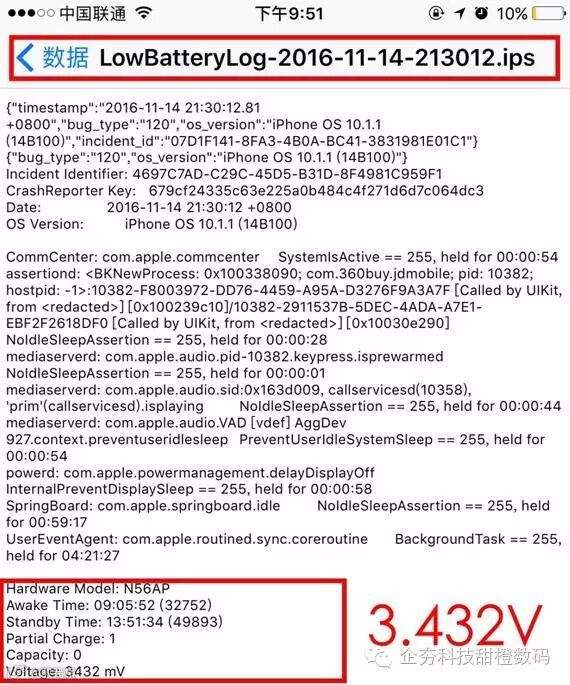 可以看到关机时电池电压3.432V,不满足iPhone工作供电电压3.7V-4.2V,所以自动关机就会发生。