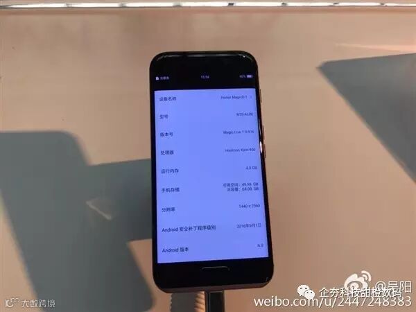 配置方面,图片显示其搭载了麒麟950处理器,内置4GB内存和64GB机身存储空间,其余规格还有待进一步确认。