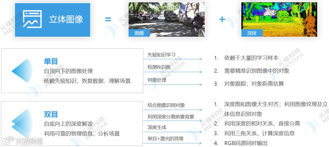 而双目是基于数学测量方式,就像我们人眼一样,我们走到任何一个地方,不需要知道这个地方有什么东西,也可以判断它的距离有多远。双目立体视觉不需要大量的先验学习,它利用可靠的物理信息分析场景,得到很详细的信息数据。