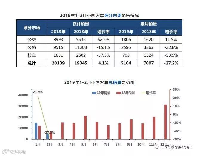 2019年1-2月,中国客车行业销售收入95.6亿,同比增长24.4%。中国客车行业5米以上客车产品累计销售20139辆,同比增长-4.1%。2月份实现销售收入24.5亿,同比增长-9.1%,2月销售5104辆,同比增长-27.2%。统观各细分市场,公路与校车市场均实现连续负增长,形成鲜明对比的是公交增量尤为明显,连续两个月的增长动力源自公交的高增长。其次,新能源对前两个月的贡献度较去年同期更高,达到48.7%。新能源公交的增量非常明显。虽然2019年新能源补贴政策还未明确,但从销量看2018年2月发布新能源政策的周期性给予了市场信心,促成了1月销量的高增长以及2月的快速回收。