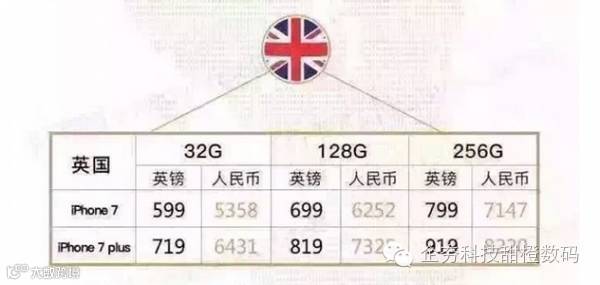 在欧洲方面,我们以英国为例,32GB iPhone 7/7 Plus 售价为 599 英镑和 719 英镑,约合人民币 5358 元和 6431 元,这与国行版的售价差不多,如果你刚好想去英伦享受英式下午茶和喂一下鸽子,在英国购买 iPhone 7 也不会亏多少。