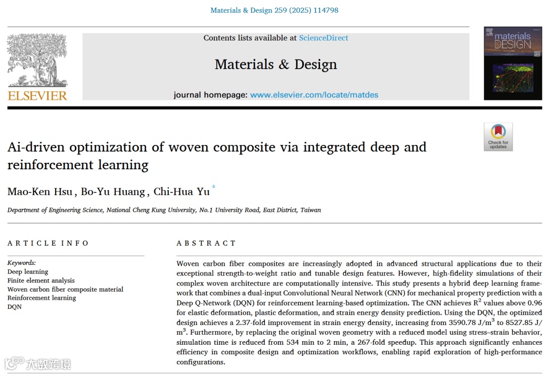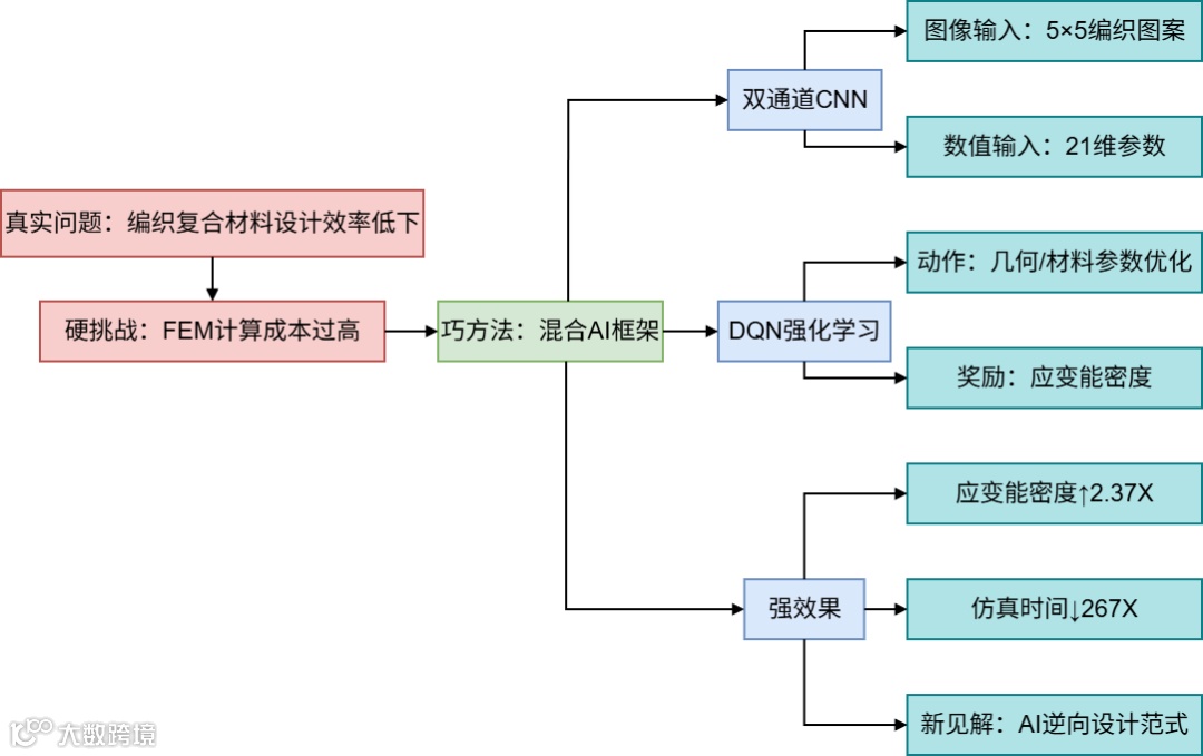 "这篇论文发现了一个关于编织碳纤维复合材料设计效率低下的真问题。该问题的核心硬挑战在于*高精度有限元模拟(FEM)的计算成本过高。为攻克这一挑战,作者提出了双输入CNN预测+DQN强化学习优化的混合框架的巧方法。该方法取得了应变能密度提升2.37倍、模拟时间减少267倍的强效果,最终凝练出AI驱动逆向设计范式可替代传统仿真流程的新见解。"