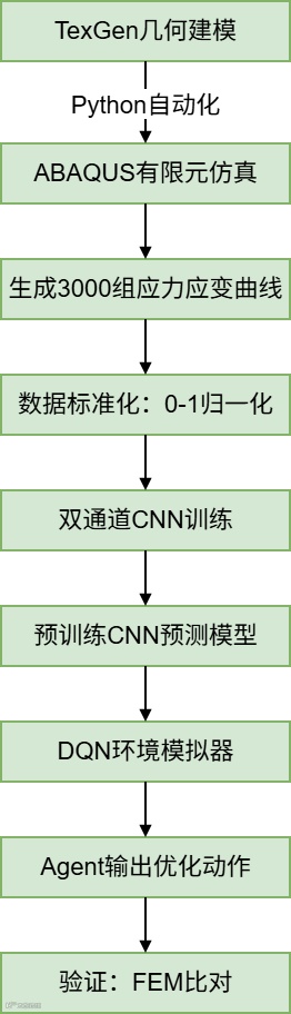 • 范式颠覆:CNN预测应力应变曲线(40点采样)可完全替代FEM作为DQN的环境模拟器。 -
