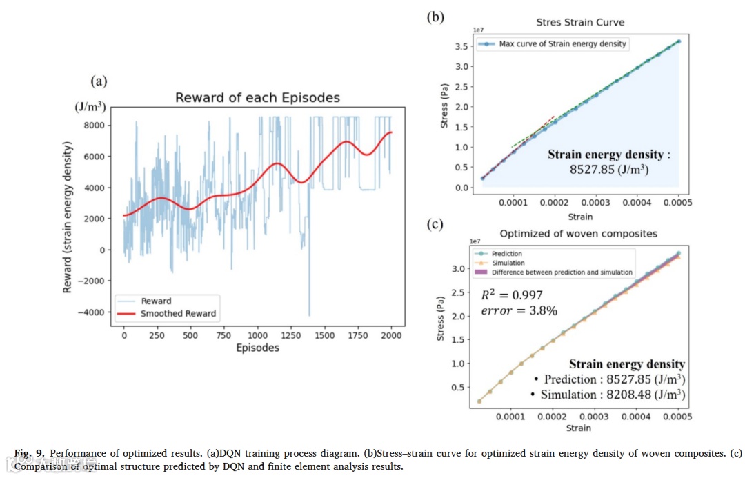 本研究通过双输入CNN与DQN的集成,在编织复合材料逆向设计中取得重大进展。该方法不仅精准表征材料力学性能,还使仿真效率显著提升。基于有限元数据训练的CNN模型在弹性区( )、塑性区( )和应变能密度( )预测中均表现出色。结合DQN的优化设计使应变能密度较初始构型提升2.37倍。简化模型实现267倍加速,凸显AI框架替代传统FEM的工程价值。