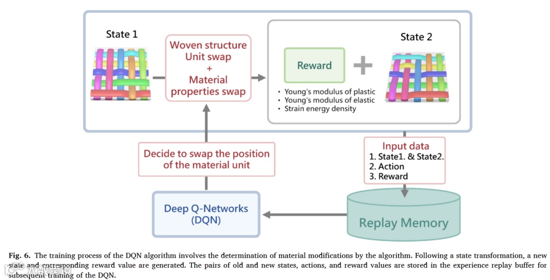 • DQN马尔可夫决策:状态 = (编织图案, 参数向量),动作 ∈{翻转位点, ±Δ尺寸, 切换材料} -