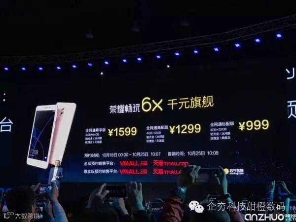 售价方面,荣耀畅玩6X全网通标配版(3GB+32GB)为999元,全网通高配版(4GB+32GB)为1299元,全网通尊享版(4GB+64GB)为1599元。新机在10月18日零时开始接受预约,消费者可在华为商城和天猫预约荣耀畅玩6X全系列,新机在10月25号10:08开卖。