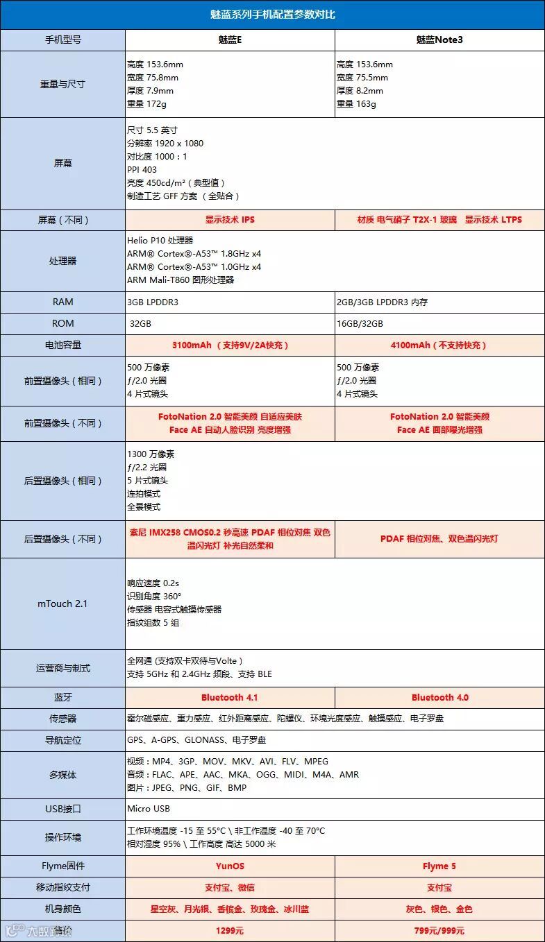 从相关重要参数进行比较发现,魅蓝E和Note3高配版 虽然在CPU,RAM、ROM、前置摄像头规格已经全网通网络制式方面基本相同,但却在相关细节参数上我们发现其亮点。