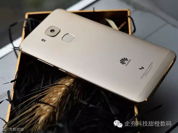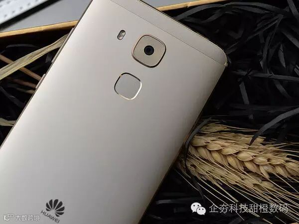 背部摄像头微微凸出,而指纹识别元件微微凹陷,相同圆角造型和高光切边,设计得很精致。下方有华为和麦芒的LOGO。