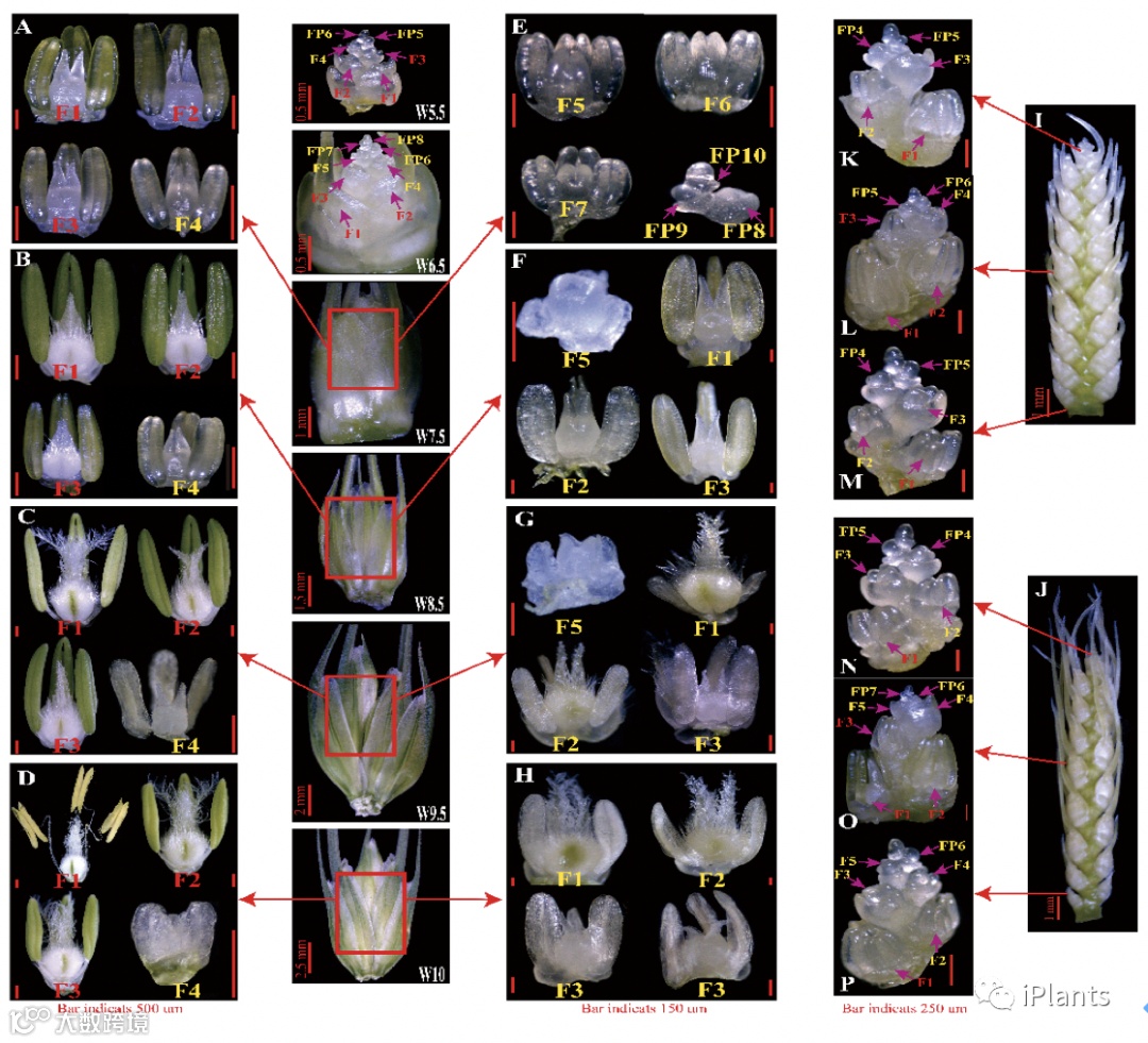 研究团队在大田条件下系统调查了小麦小花发育的动态及其对水氮供给的响应。首先发现,开花期麦穗的最大可育小花数并不决定于小花原基最大分化数量,而决定于达到最大小花分化数量时(小花处于W7.5时期)具有绿色花药(图1)的小花数量:即在W7.5时期小花花药是否转绿(绿色值≥97)决定了其此后的命运,已转绿的继续发育,未转绿的则逐渐败育,最终退化。研究表明,在小花分化阶段 (W5.5-W6.5),增加氮肥和水分供给促进了小花分化。