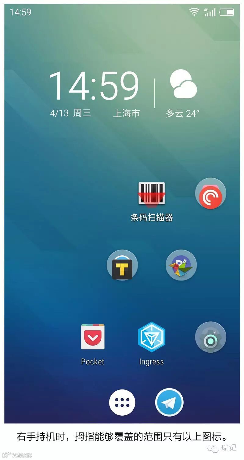 不过实体键的未来可能并明朗,随着市场的不断成熟,用户大屏设备的操作性和便携性要求越来越高,而设备的屏占比会进一步提升。在这种情况下,正面越来越小的下巴会越来越压缩实体键的存在空间,到时候魅族如何来解决这个问题就要再考虑了。而另一方面,正面的指纹识别和机械 Home 键自然会比电容键和虚拟键更占用内部空间,如果数据口仍然要设计在下方并且保持居中,就势必会和 Home 键抢占空间,这和设备的轻薄化又是一个矛盾。魅族曾经的小圆圈是非常优秀的设计,后来转为 mTouch 之后实际上导致了屏占比的倒推(在 note 3 上,不调整握持位置拇指能够覆盖的范围只有上图那些图标)。本次魅蓝 note 3 虽也将轻薄作为卖点,但毕竟是千元机不必要求过高。而在实体的 mTouch 下旗舰系列的 Pro 能够达到怎样的厚度极限,这也是值得继续观察的。