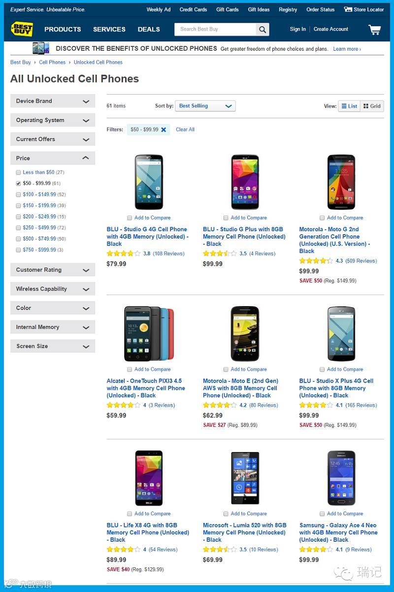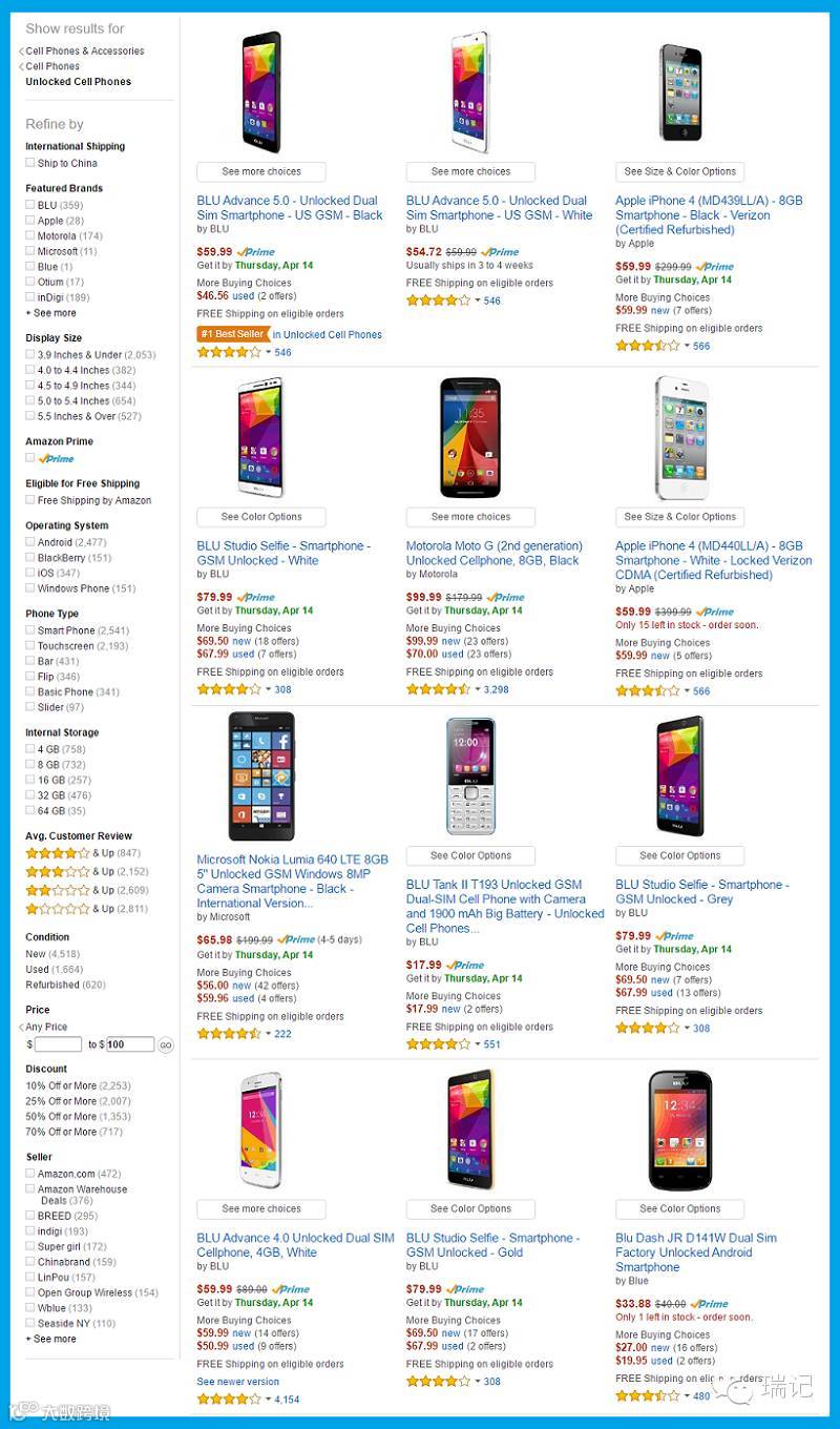在中国销售的手机,售价的一大组成部分就是 17% 的增值税。799/1.17≈¥683,差不多刚好是 100 美元。在国外销售的手机,税的价格都是单独计算的(所以 iPhone 是无法以发布会上 X99 的价格买到的,况且除了加税像国内这样不限运营商的无锁版还要更贵)。那么在国外购物网站上,国外消费者以 100 美元的可以买到什么当次的手机呢?我截个图给你看。