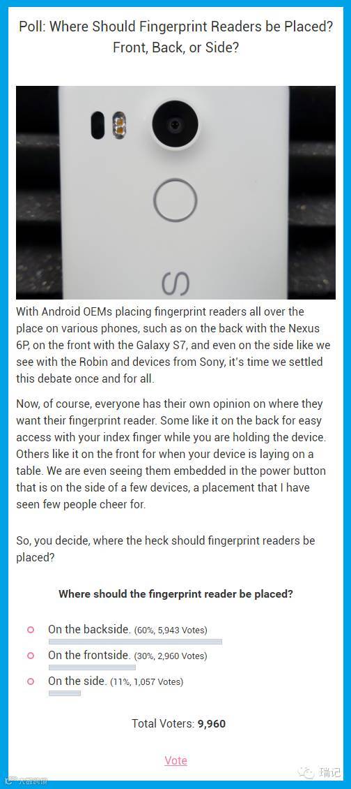 就在魅蓝 note 3 发布后没几天,著名科技媒体 Droid Life 进行了一项调查,邀请读者们对指纹识别传感器的位置进行投票: