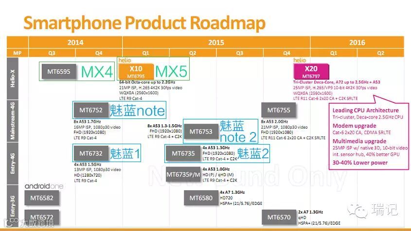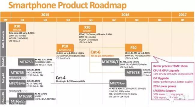 从 MX4 的 MT6595 开始,魅族用一款核心产品把 MTK 捧上了主流市场。而装载了 MT6752 的魅蓝首款产品魅蓝 note(初代),则凭借优秀的性能和续航表现获得了「魅族真旗舰」的爱称,吊打同期同档次的骁龙 615 处理器。以这两款产品作为锚点,来看看魅蓝 note 3 搭载的 P10 处理器的真身。这里用到一个工具,就是芯片厂商的 Roadmap(路线规划图)。虽然 Roadmap 会不断调整,但会大体上显示出芯片的定位和迭代关系。