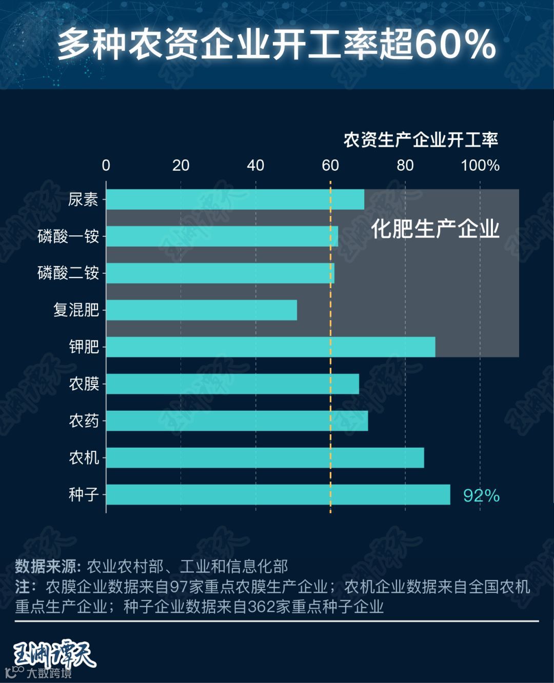 多种企业开工率超过60%,种子、钾肥、农机的企业开工率已经达到90%上下。