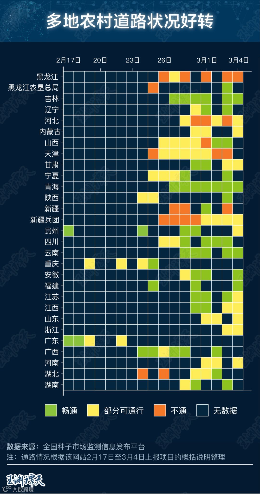 通过对全国种子市场监测信息发布平台的数据整理发现,在2月17日至3月4日这段时间里,平台监测范围内的农村道路,正在从“不通”变成“畅通”,目前南方农村的通路情况,普遍优于北方。
