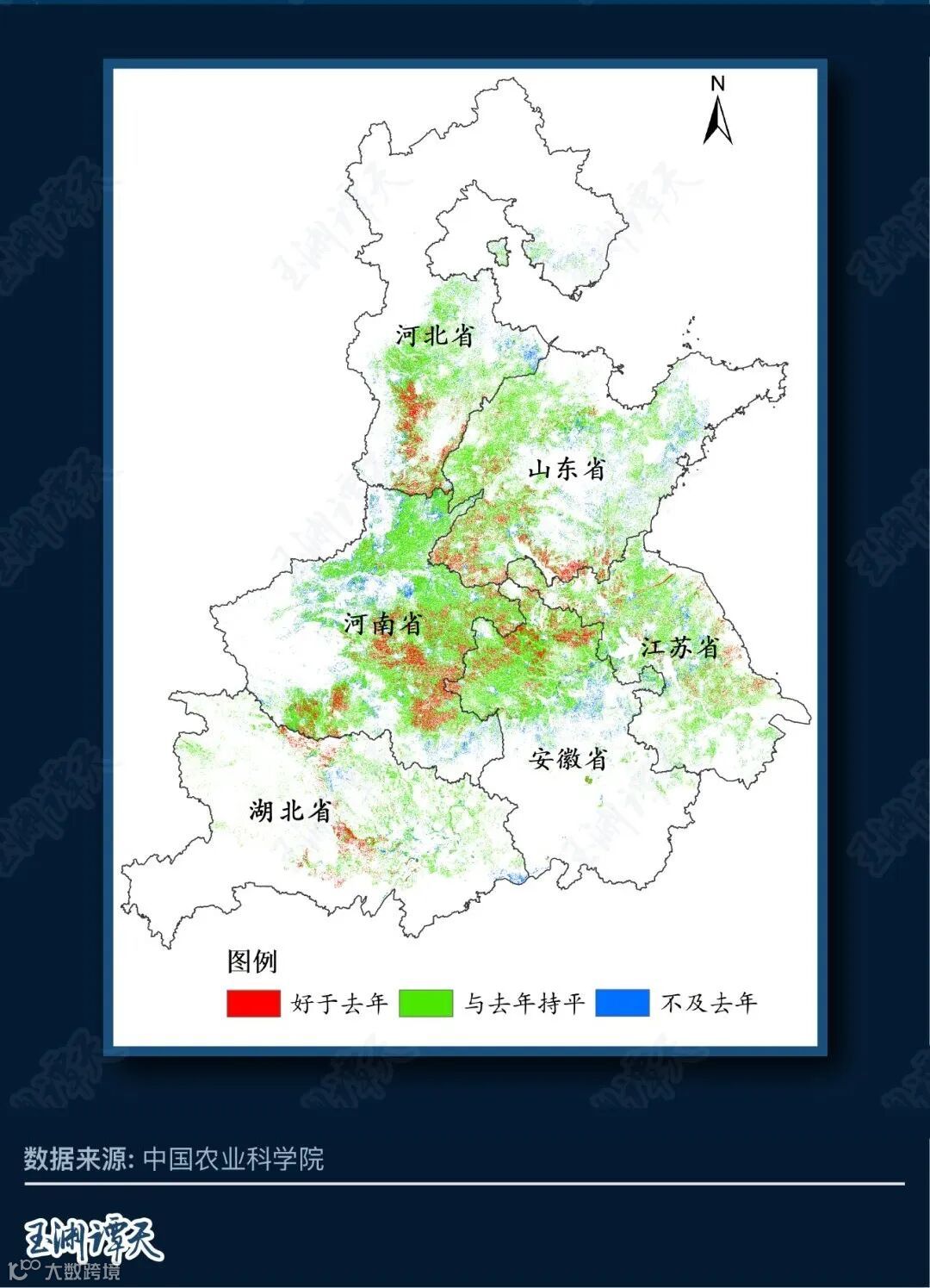 中国农科院这张刚刚绘制出的遥感地图,解析了300多万个像素点在10天时间里的卫星拍摄影像。它告诉我们,在6个冬小麦主产区中,绿色表示与去年同期“长势持平”,比例高达74.4%;红色部分则意味着好于去年,占比14.3%;长势不及去年的比例为11.3%。