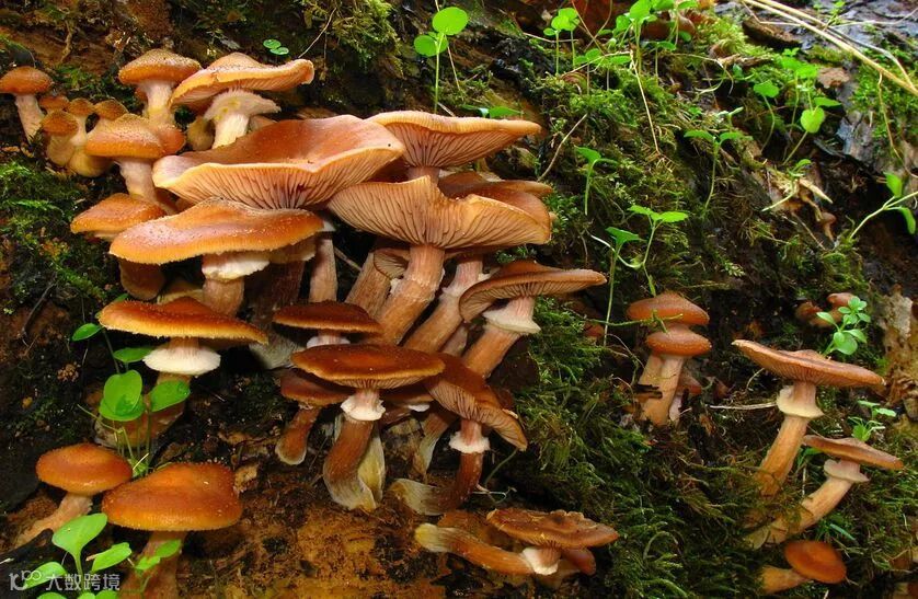 ❸Armillaria fuscipes主要分布在南非地区,可以引起茶树、松树和各种硬木树等树木的根腐病。Armillaria nabsnona主要分布于北美、夏威夷和日本的西海岸,菌帽为橙棕色,可以与天麻共生。▼