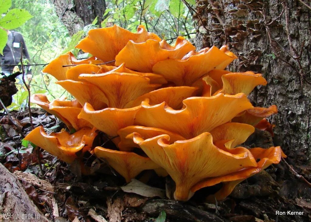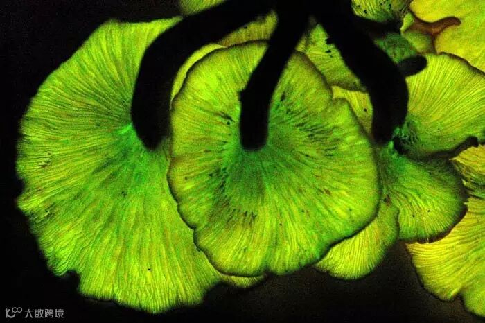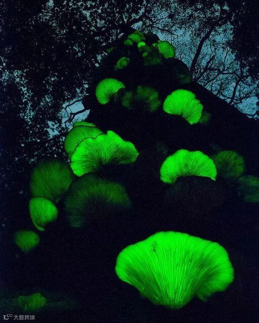 ❷发光类脐菇中另一个比较出名的种类为Omphalotusolearius,通常成簇地生长在橄榄树及橡树的基部。这种发光类脐菇因奇特的绿光被称为“鬼魂真菌”,有剧毒,人在食用30分钟内便会出现不适,其发光原因尚不明确,有人认为是寄生其上的昆虫所致,也有人认为是微生物副产物作用。▼