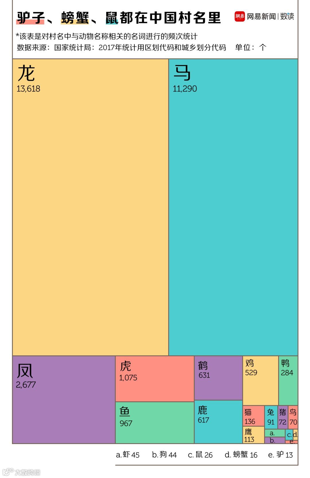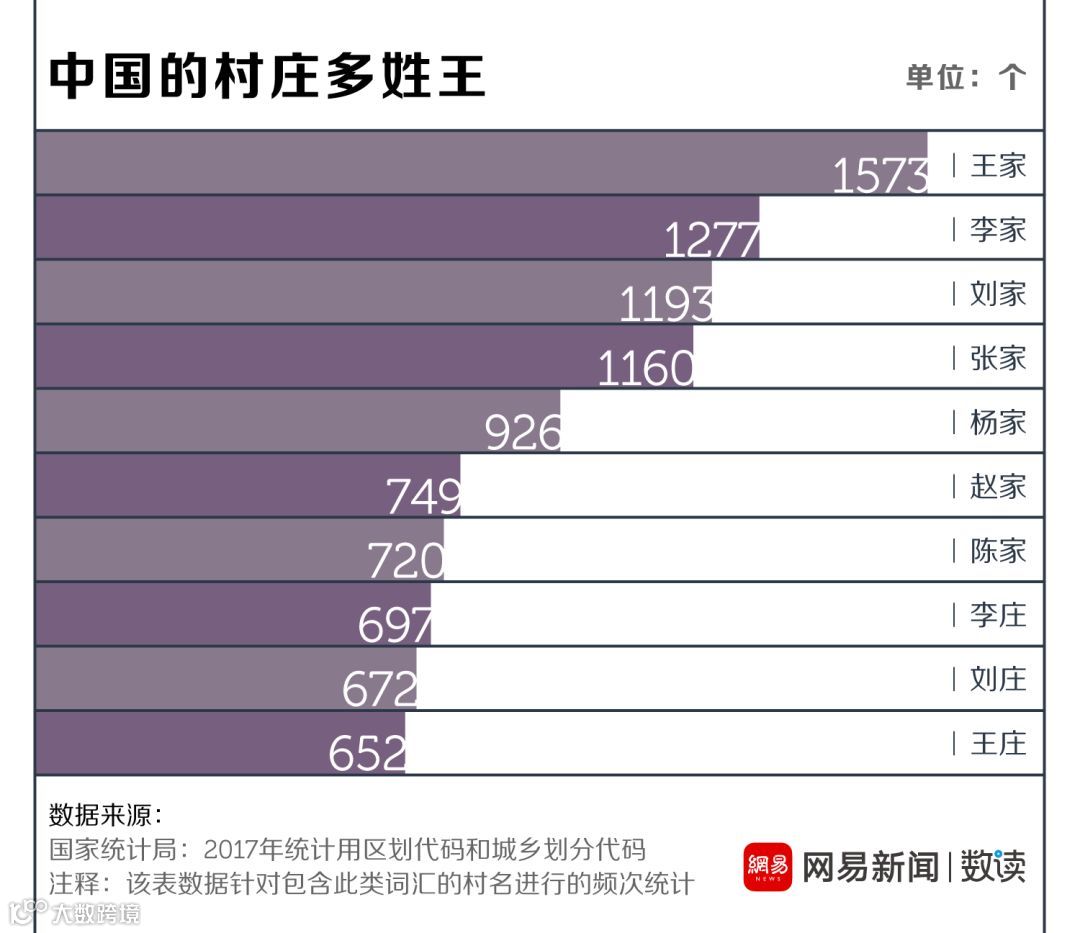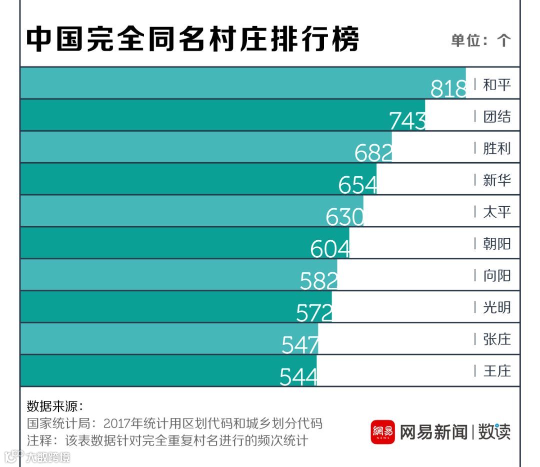 数读菌利用爬虫爬取了国家统计局2017年最新版城乡区划代码中的67万余个村名。在对其进行了匹配分析后,发现高度的重复是中国村一级行政区名称的最大特色之一。
