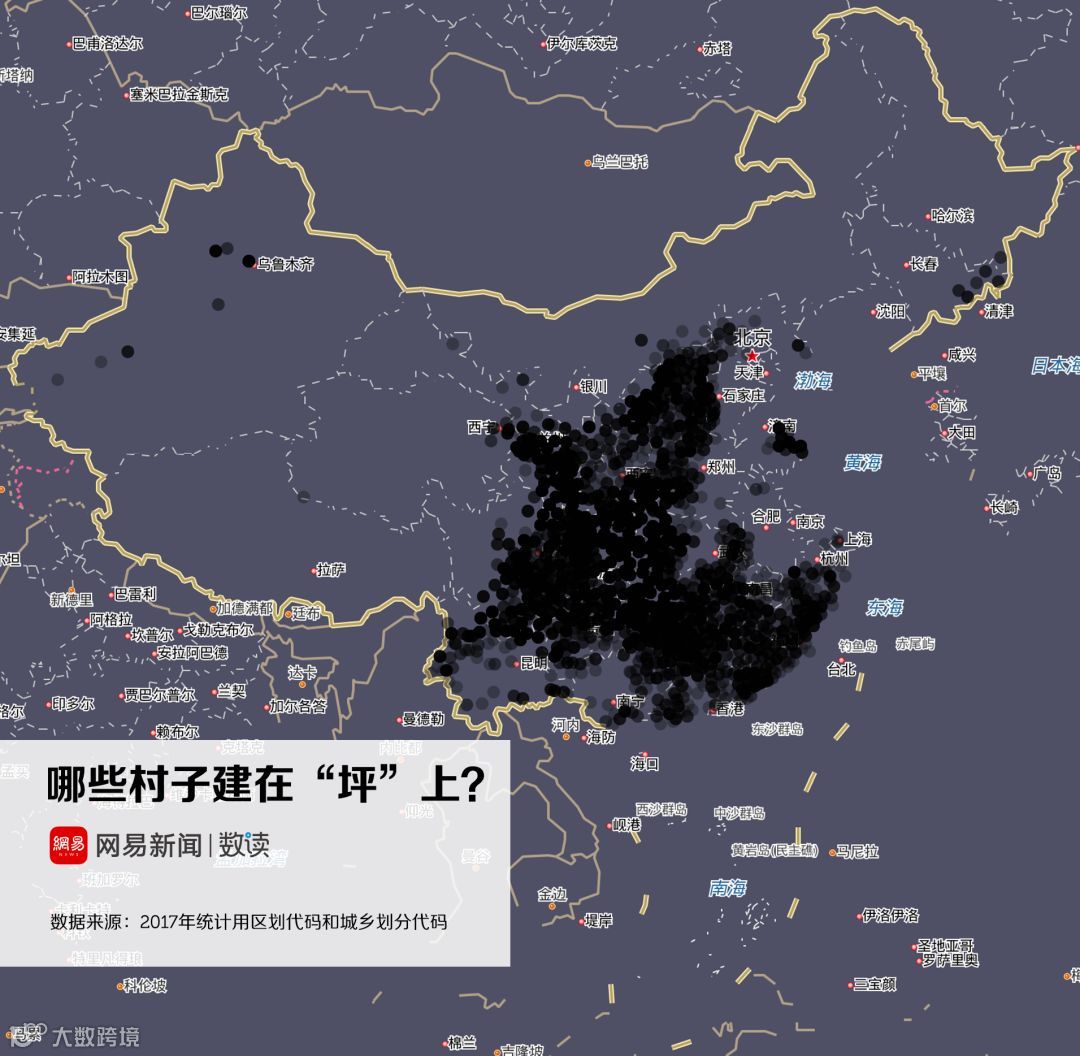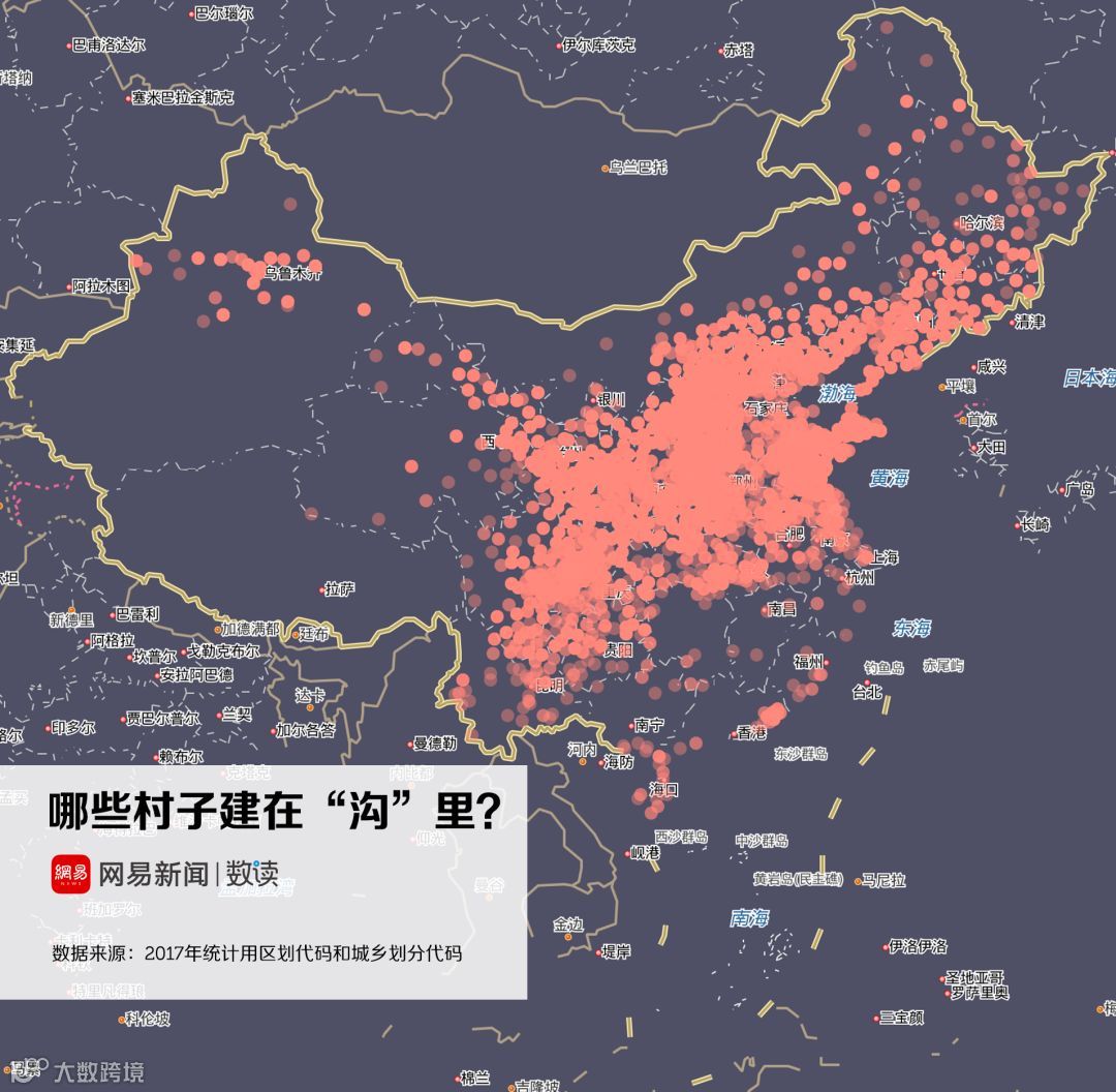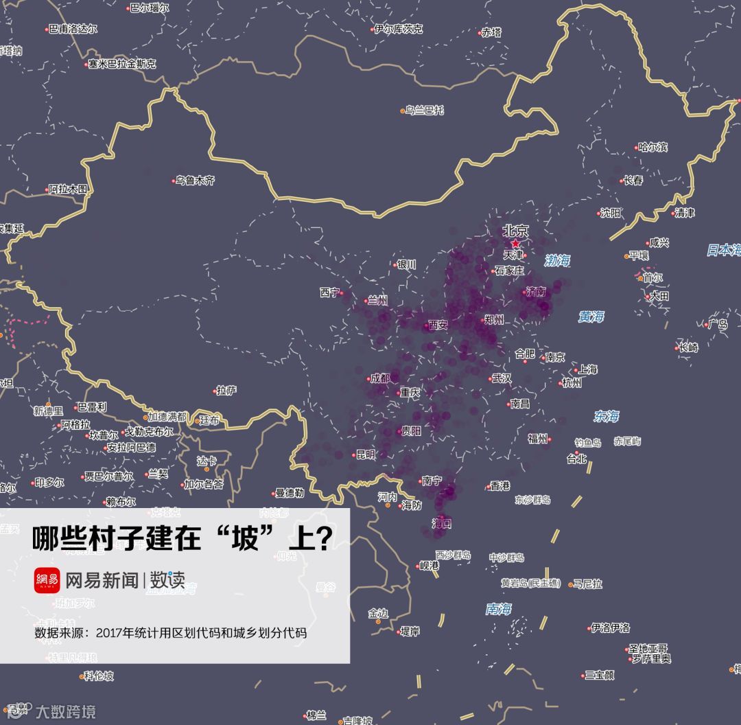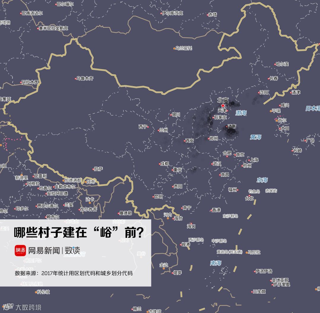 实际上,这跟中国地名的命名规则有关。根据地形、因地制宜地为村庄命名,是自古代就流传下来的命名规则。诸如“山”、“河”、“沟”、“湾”、“坪”都是中国村名中极度常见的字眼。地形地势的差异,也造成了村名在地域分布上的离散与集群。