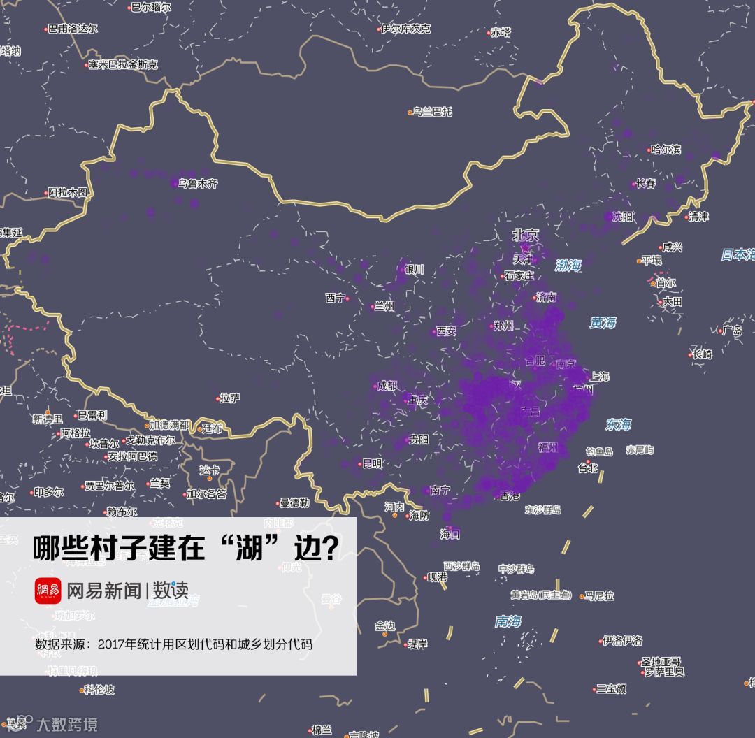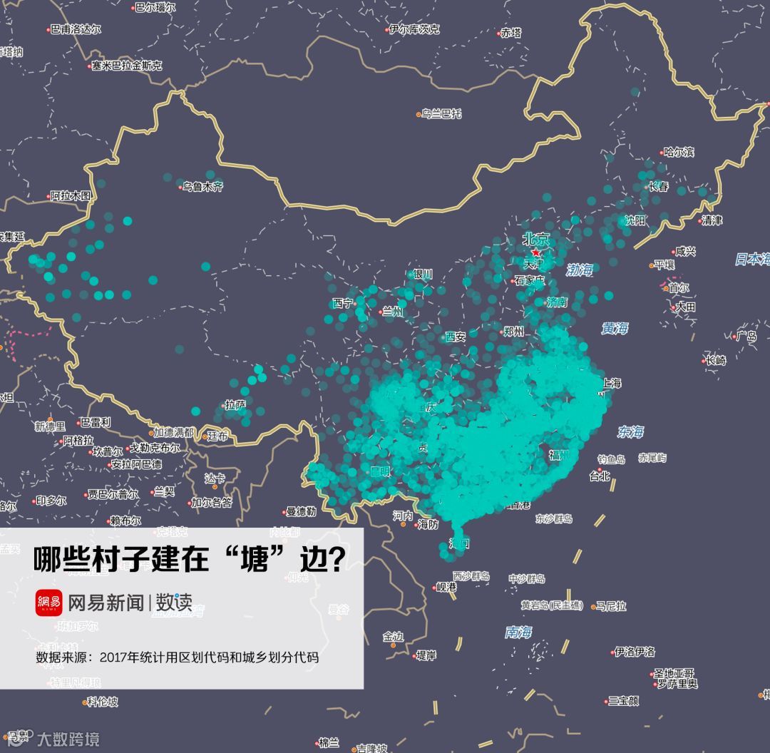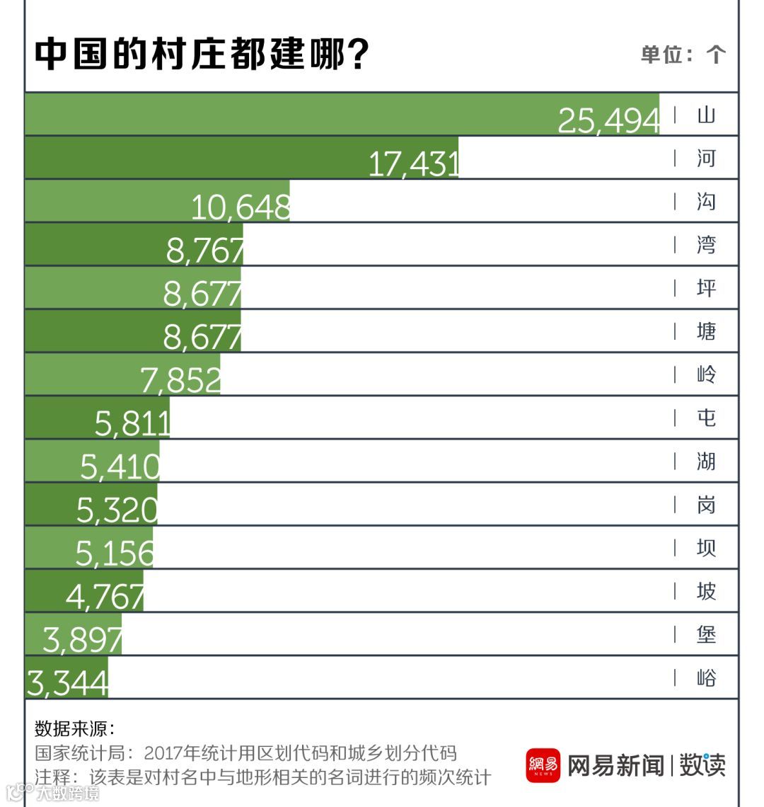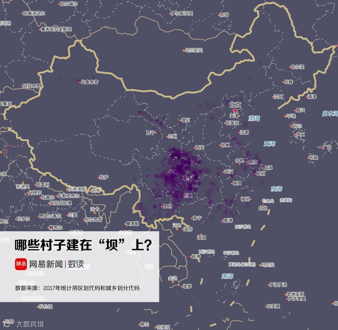 实际上,这跟中国地名的命名规则有关。根据地形、因地制宜地为村庄命名,是自古代就流传下来的命名规则。诸如“山”、“河”、“沟”、“湾”、“坪”都是中国村名中极度常见的字眼。地形地势的差异,也造成了村名在地域分布上的离散与集群。