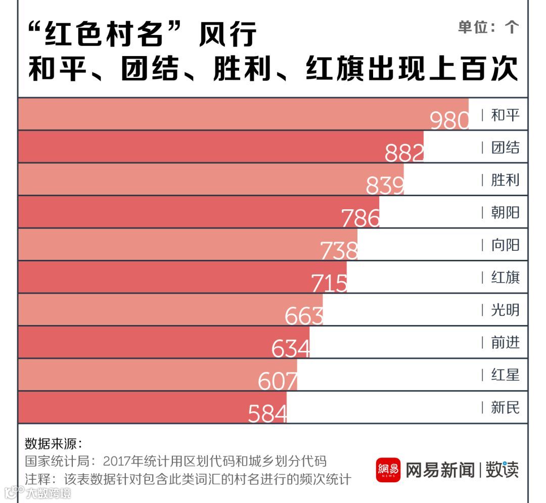 数读菌对67万多个村级行政单位的名称进行模糊查询,发现包含此类词汇的村庄数量更多。“和平”、“团结”、“胜利”出现频次都在800以上,红色村名在乡村间十分风行。