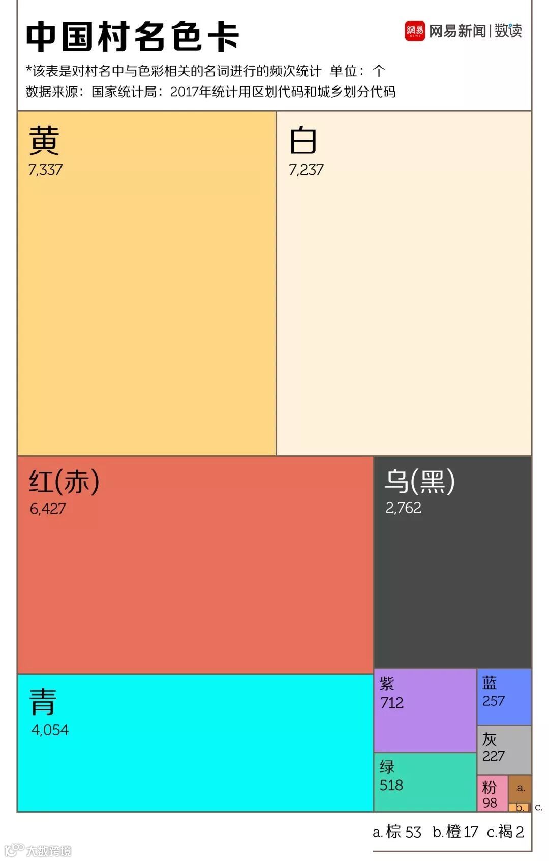 中国的地名也可以有缤纷的色彩。数读菌对67万村名进行了关于色彩相关词汇的频次统计后发现,倘若为中国的乡村绘上一张色卡,那么它将偏向橘色的暖色系。村庄以颜色命名,其依据有很多。