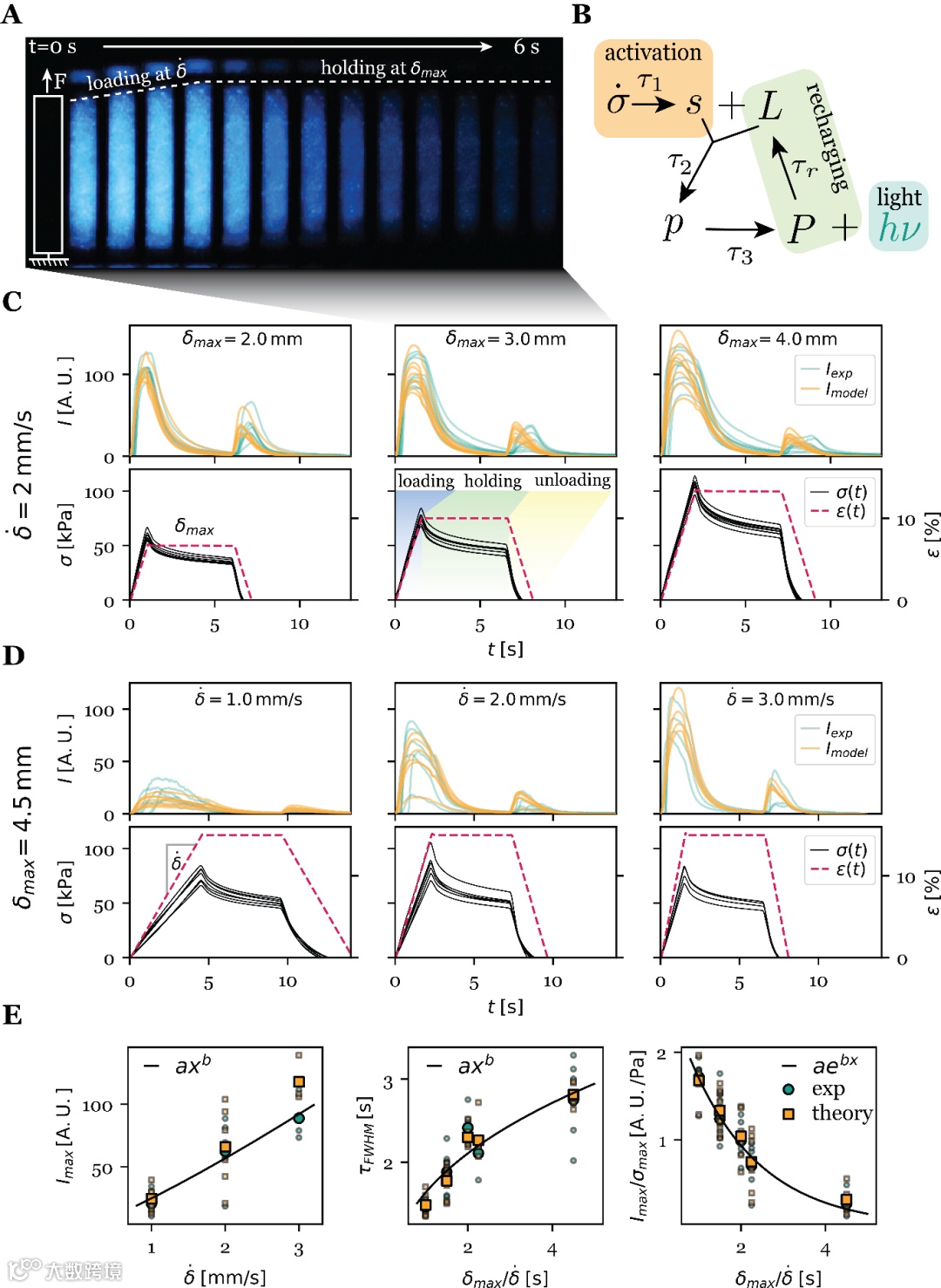 ,并控制最大位移δmax不变(图 5D)。同时,作者通过视频处理,得到了发光强度随时间的变化曲线。