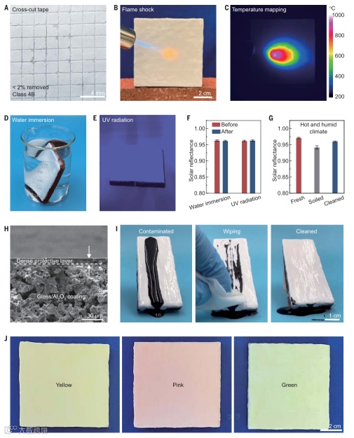 马里兰大学胡良兵教授领导的研究团队,最近研制了一种新型辐射制冷涂层。这种涂层成功结合了低熔点玻璃骨架和氧化铝颗粒,展现了高效的太阳光反射能力、红外发射能力和环境稳定性。该复合材料的关键特性在于其玻璃骨架能够选择性地发射低温的红外光,同时保持了较高太阳光反射率。并且,氧化铝颗粒的加入不仅增强了阳光的散射效果,还有效抑制了材料制造过程中的结构致密化引起的太阳光反射率的下降。在户外实际实验中,这种涂层在高湿度环境下表现出显著的降温效果。例如,在空气湿度为80%RH条件下,它可以将白天和夜晚的环境温度分别降低3.5°C和4 °C。此外,即使在极端条件下,如水、紫外线辐射、污垢和高温影响下,这种涂层仍能保持高效的太阳光反射性能。值得注意的是,该涂层表面还可以添加超薄的透明玻璃防护层以增强其抗污性,或添加颜料制成彩色玻璃。