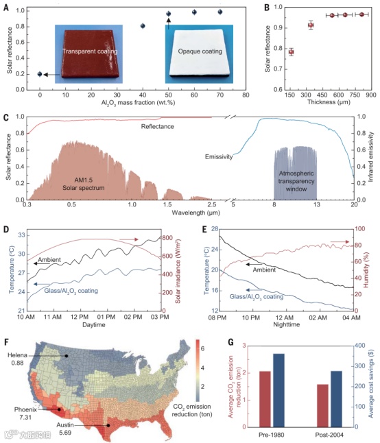 研究团队对辐射制冷玻璃涂层在太阳光谱区和红外区的反射率和发射率进行了测试,显示出团队研制的新型涂层同时具备高太阳反射率(约0.96)和高发射率(约0.95)。在美国马里兰大学的亚热带湿润气候条件下的测试表明,涂层在白天和夜间具有优异的亚环境辐射冷却性能。此外,该涂层在冷却过程中减少二氧化碳排放的潜力显著,每年可为建筑节省显著成本。
