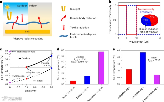 (图1c、d)。对于室内环境,自适应型纺织品的皮肤表面温度略高于透射型纺织品的皮肤表面温度(0.8°C),但明显低于发射型纺织品的皮肤表面温度(2.5°C)(图1c,e)。