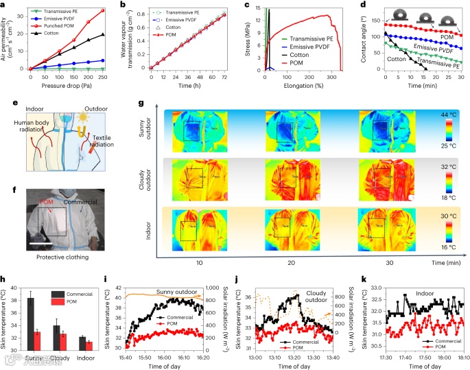 。在各种户外环境中,POM 纺织品的辐射冷却性能比商用防护服显着增强(图4g-j)。POM纺织品还表现出更好的室内冷却性能(图4h,k)。
