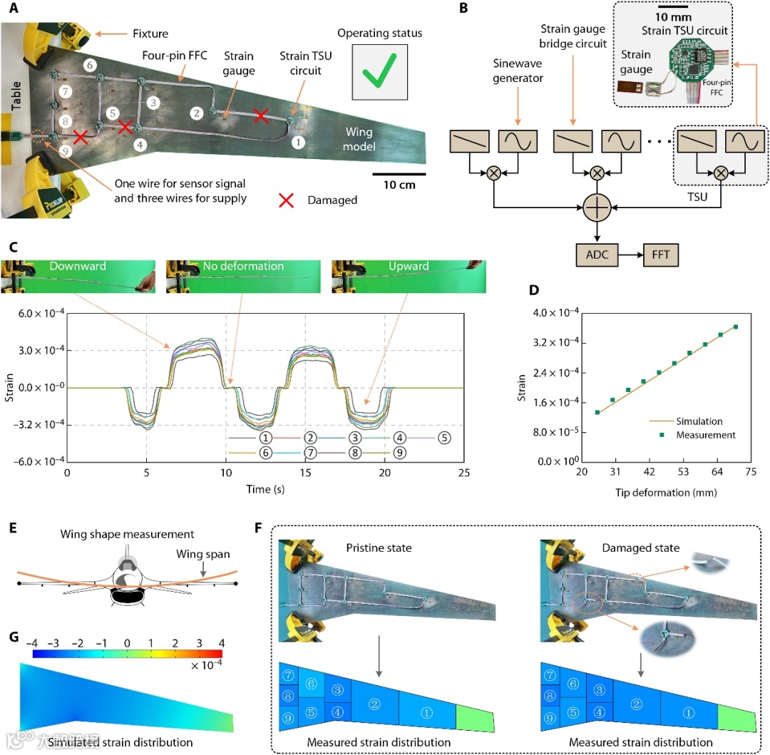 图5. TSM技术用于监测机翼应变分布。(A) 用于验证由九个TSM应变传感单元组成的TSM效果的实验设置。(B) 应变TSM的原理框图和TSM应变传感单元的放大图。(C) 在机翼不同变形条件下,九个TSM应变传感单元在不同位置的应变波形。(D) 1号TSM应变传感单元在机翼不同形变程度下的测量值和仿真值。(E) 在开发的用户界面中直观显示机翼形变情况。(F) 原始状态和受损状态下,TSM测量得到的粗糙应变分布。(G) 机翼向上弯曲时仿真的应变分布。
