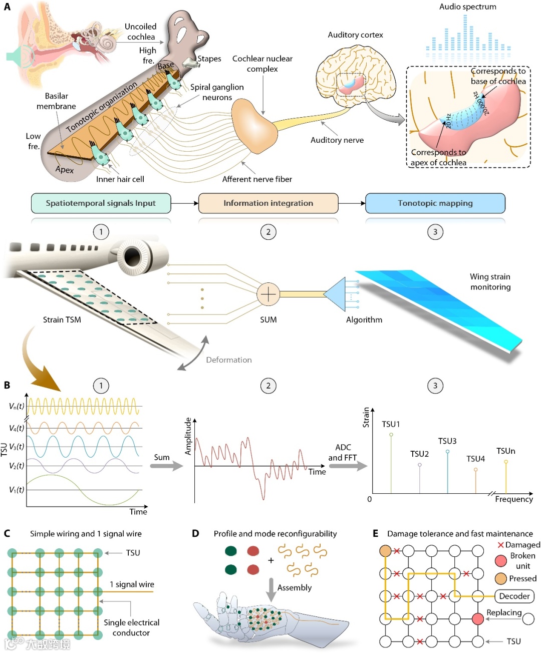 图1. TSM的灵感、原理和优势。(A) 人类听觉系统与TSM系统的对应关系。(B) TSM原理示意图。(C) 简单的布线和单信号线输出。(D)各种类型的传感器单元随意与蛇形网络连接线结合,以实现不同三维几何形状上的多模感知。(E) 连接网络抗损坏和传感器单元可快速维护。
