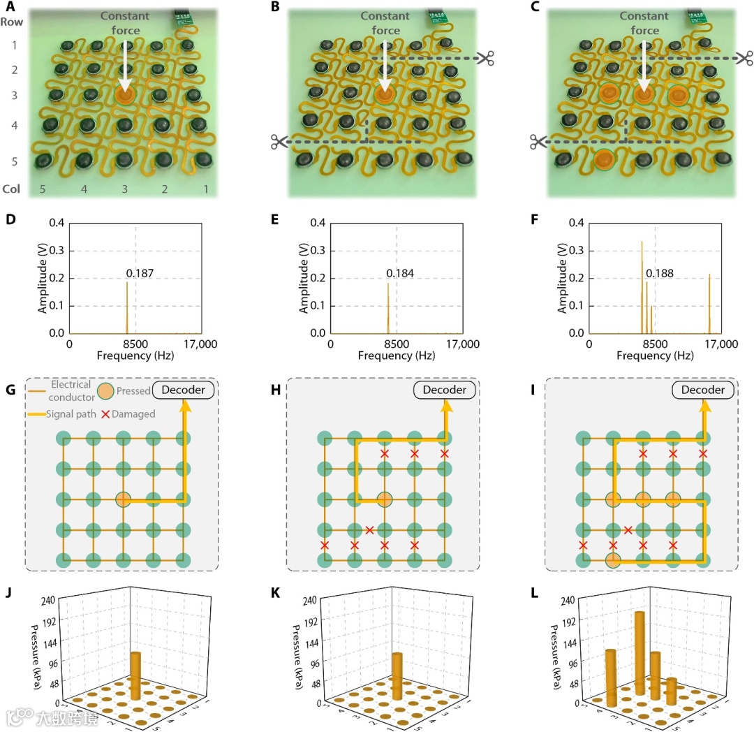 图3. 压强TSM的耐损伤和无串扰能力。(A) 在5×5可拉伸压强TSM的中心传感单元(坐标3,3)上施加了一个恒定力。(B) 在多个不同位置的连接网络受损的情况下,同样的恒定力也被施加在5×5可拉伸压强TSM的中心单元(坐标3,3)上。(C) 在(B)的基础上,同时也对相邻的单元(坐标3,2)和(坐标3,4)以及单元(坐标5,4)施加了压强。(D)至(F) 对应于(A)至(C)三种情况的频谱。(G)至(I) 损伤前后的信号传输路径。(J)至(L) 用于直观显示施加压强的级别和位置的3D柱状图。
