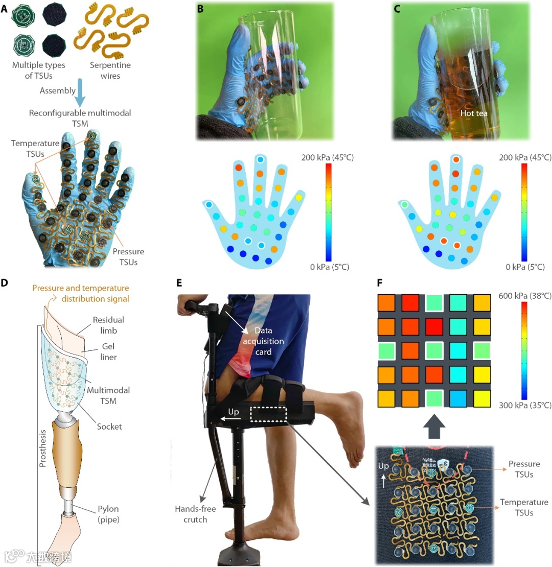 图4. TSM的外形可重性和多模TSM构建。(A) 通过快速组装TSM温度传感单元、TSM压强传感单元和蛇形连接线形成的掌形单线双模TSM。(B) 使用构建的双模TSM抓取空杯,手掌上的压强分布和四个位置(带有白色圆圈)的温度在下方显示。(C) 抓取装有热茶的杯子,手掌上的压强分布和四个位置(带有白色圆圈)的温度在下方显示。(D) 双模TSM在假肢-皮肤界面的压强和温度测量中的应用。(E) 双模TSM被放置在免撑拐杖的支持表面和腿之间,以简单评估双模TSM应用于假肢-皮肤界面的压强和温度测量。(F) 腿部的压强分布和五个位置(带有白色轮廓)的温度。