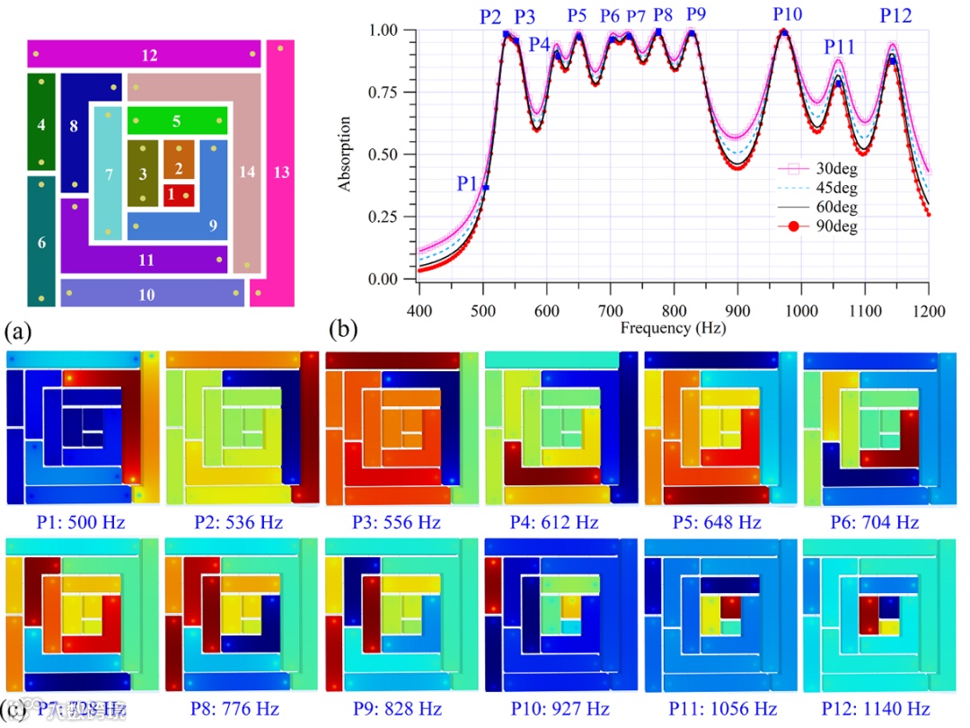 为了实现宽带吸声性能,在100 mm × 100 mm的平面空间内,作者通过空间折叠,并按长度梯度分布的关系设计了一个多单元集成结构,如图6a所示。结构一共包含14个单元,单元1和2由于通道过短,只开了一个孔,而其余单元均开了两个孔。从图6b中的计算结果可以看出,在500Hz到1200Hz的宽带内,获得了大约10个清晰的吸声峰,以及9个明显的低谷。从多单元并联式协同耦合的角度讲,出现幅值较低的低谷的原因是梯度单元间梯度分布过大。但从图6a的长度梯度来看,并不存在梯度过大的情况。因此,这也可以说明,这种集成结构中,单元间的耦合关系不能忽略。另外,在较高频带吸声性能变差的原因在于,频率越高,单元的有效吸声面积越小。所以在吸声频率较高的单元主导的吸声频率处,一些声能无法有效到达吸声单元,而是被反射回去了,从而造成吸声性能降低。为了清晰地揭示吸声峰产生的机理,我们在图6c中绘制了图6b中标记的点处的声压分布。从6c图中可以看出,在P1点处,通道长度最大的14号单元产生共振。然而,由于此时其余单元共振频率尚未接近,没有单元和该单元产生足够的耦合和相位相干相消作用,所以吸声系数幅值较低,没有形成吸声峰。在P2点到P6点处,单元13号、12号、11号、10号和9号依次产生共振,同时也伴随着其它单元的明显振动,特别是P3和P5处。在P7、P8和P9处,均有2到3个单元产生强烈共振,使得吸声系数处于较高水平。在P10、P11和P12处,单元4、2和3产生共振,而其余单元基本不产生振动。