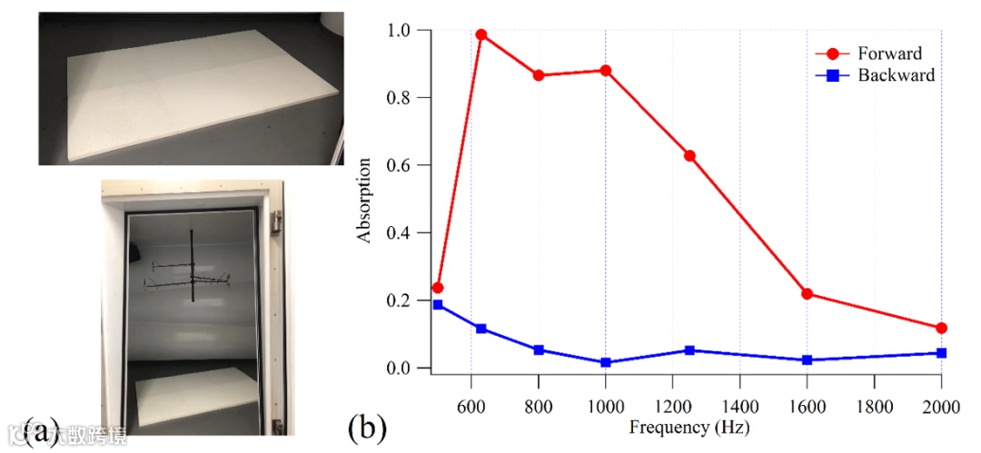 为了评估不规则入射下的吸声性能,以符合实际舱室应用条件,作者通过3D打印制作了六个边长为0.5m的方形大尺寸样品,形成了一个1.5 m×1.5 m的测量样品,如图9a所示。在体积为9m3的标准混响室内,根据ISO 354:2003标准测量了吸声系数,如图9b所示。在混响室条件下,600~1200Hz范围内的吸声系数超过0.85。超薄超表面结构仍然表现出优异的吸声性能。这意味着,该结构有利于工程应用(在大多数文献中,处理如此大尺寸混响室样品的成本是不可接受的)。