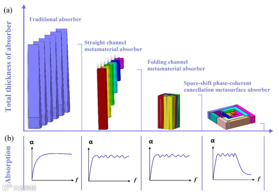 如图3所示,传统的吸声尖劈主要由多孔材料组成,其厚度达到最低吸声频率对应的1/4波长,在一定的下限截止频率以上的宽带吸收系数曲线平滑且振幅高,常用于建造消声室。随着超结构的发展,研究人员设计了基于Helmholtz 共振腔或Fabry-Pérot腔的直通道吸声结构。Helmholtz 共振腔结构的厚度低于吸声尖劈,通过不同深度的吸声单元的并联叠加可以获得多个吸收峰,从而实现宽带吸声。后来,研究人员通过空间折叠设计构建了厚度更薄的宽带吸声体,但在下限截止频率为500Hz左右时,厚度仍需达到100mm左右,难以满足装备的应用需求。考虑到对于飞机、船舶、高速列车和汽车等舱室应用,通常不需要非常宽的工作频带和非常高的振幅,而是需要较低的工作频段和非常薄的吸收结构。为此,作者通过空间尺寸转移设计将厚度方向上所需的尺寸折叠到平面薄层中,并以适当降低高频吸声带宽为代价,大大降低了吸声结构的整体厚度。由于综合利用了共振吸声和相位相干相消,虽然厚度很小,但吸声性能依然能够得以保证,是目前最薄的宽带吸声设计方案。
